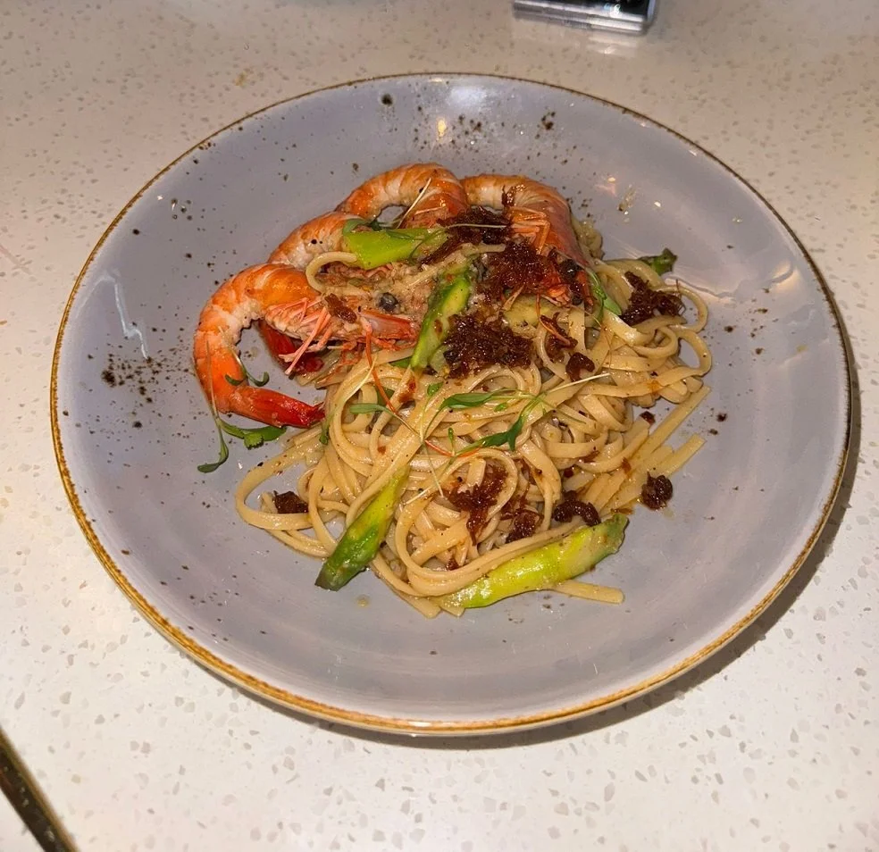 Longevity Linguine with Tiger Prawn: These noodles are served uncut (no biting through your luck!) with a spicy XO sauce.