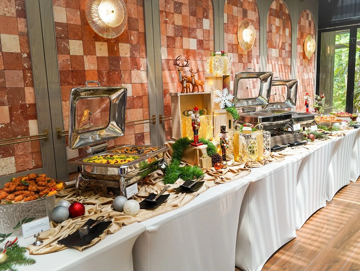 The Premium International Buffet ($159/pax): This elevated spread adds a layer of luxury with a DIY Caesar Salad station, Seafood Pumpkin Chowder, and sophisticated mains like Beef Stroganoff and Herb-Crusted Salmon. The dessert selection is also expanded to include Petite Cheesecakes and Opera Cake.