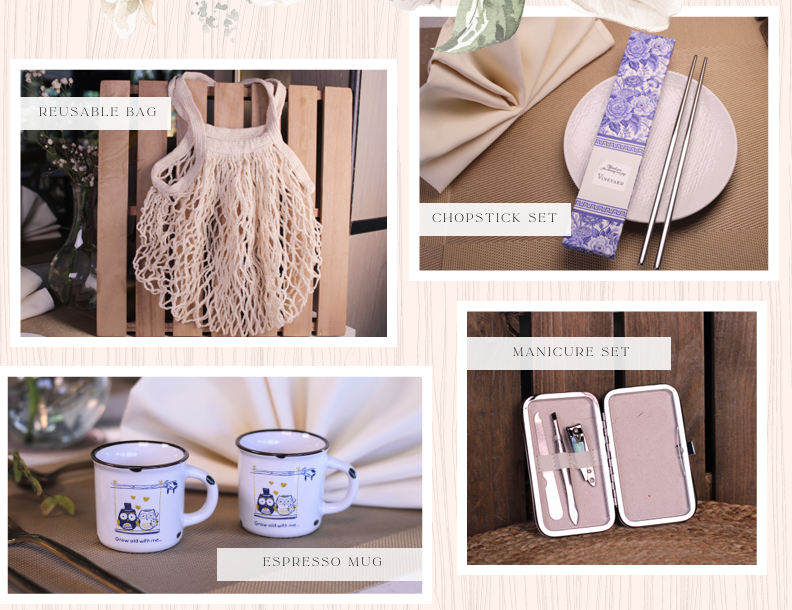 Tumbler With Singapore’s weather, a reusable tumbler is a highly valued gift. It’s a modern, lifestyle-oriented favor that guests will use daily at work or at the gym to stay hydrated.
