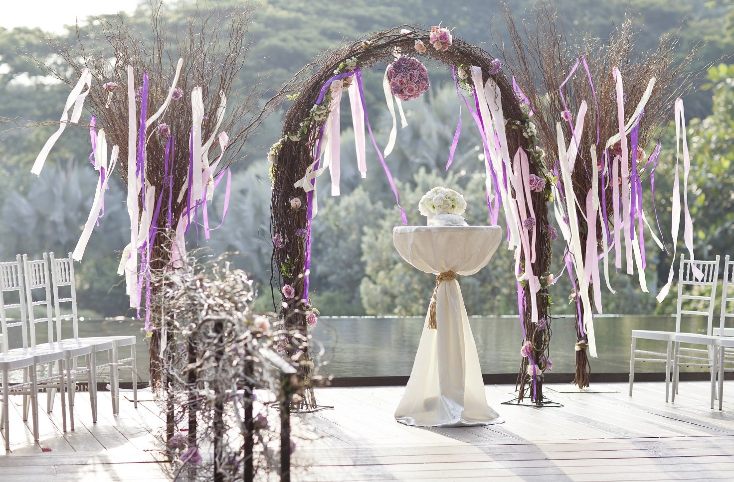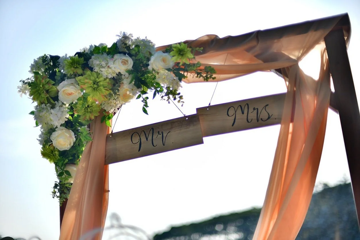 The Setup: Full solemnization setup (floral arch, decorated chairs, ring holder) and even the reception table with a money box.
