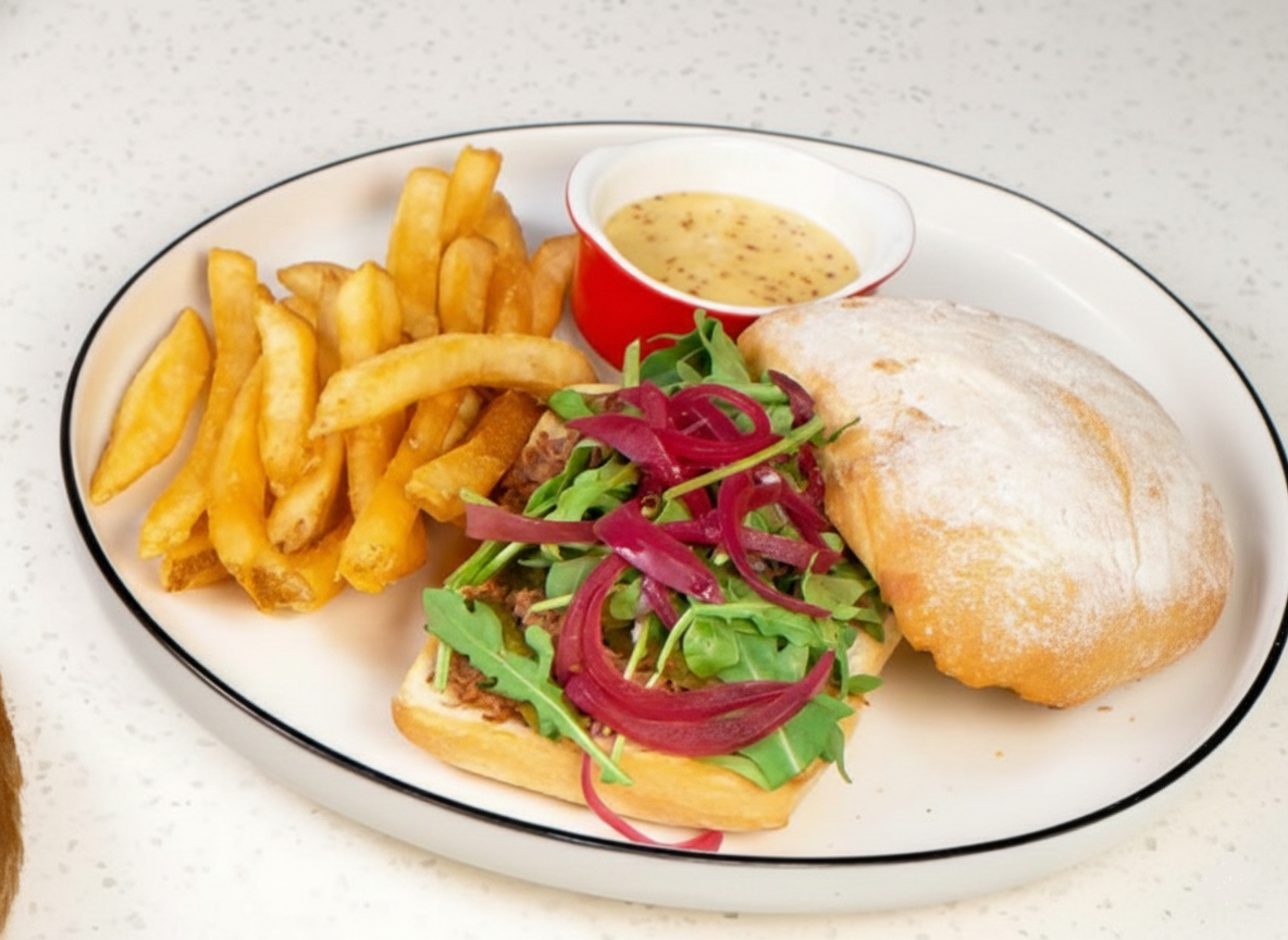French Duck Rillette Ciabatta Sandwich ($26): A savory masterpiece layered with pickled onion, cornichon, mustard mayo, and wild rocket leaves, served with golden French fries.