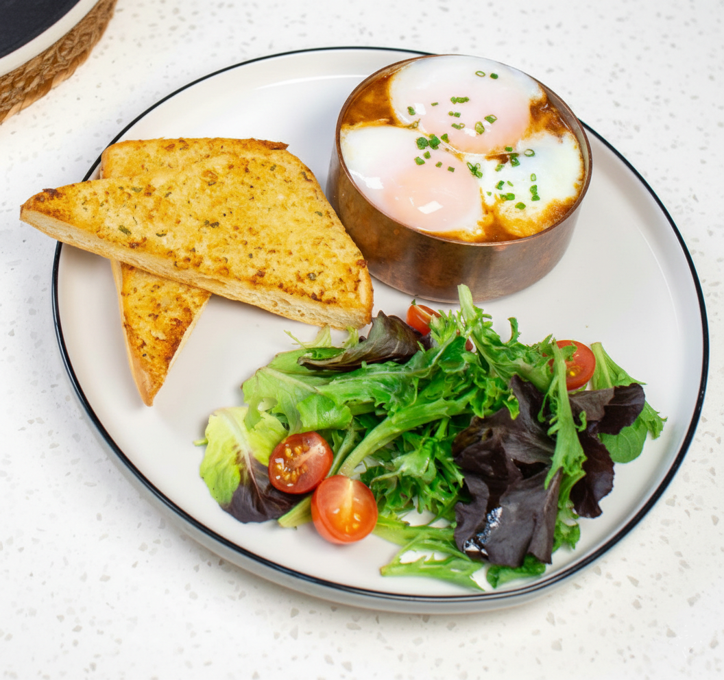 Vineyard Big Brekkie ($28): A grand assembly featuring pork sausage, house-baked beans, and earthy Kin Yan mushrooms alongside heirloom tomatoes and garlic bread. Diners can customize their plate with a choice of Prosciutto ham or smoked salmon, and eggs served three ways: Sunny Side-Up, Scrambled, or a delicate 63-Degree Egg.