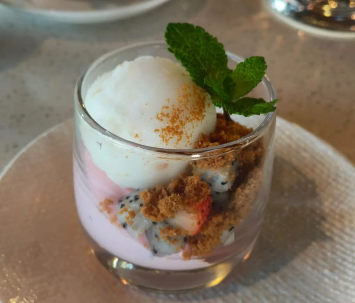 Lychee Sorbet: A light and bright finish, accompanied by Oolong Tea Gelée and a fresh Salade de Fruits.