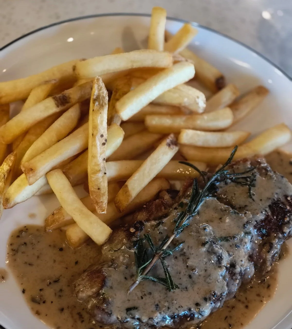 Steak & Fries (+$9 supplement): The ultimate bistro classic: Pure South Striploin Beef served with crisp French Fries and a luxurious Peppercorn Brandy Sauce.